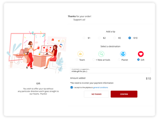 After completing their purchase, your customers will be prompted to add the amount of their choice, select a destination for their tip, and even leave a message attached to engage even more emotionally with you.